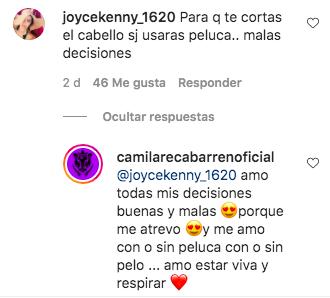 "Para que te cortas el cabello si usarás peluca.. malas decisiones", escribió la usuaria. A lo que sin pensarlo respondió Camila: "amo todas mis decisiones buenas y malas porque me atrevo y me amo con o sin peluca con o sin pelo ... amo estar viva y respirar".