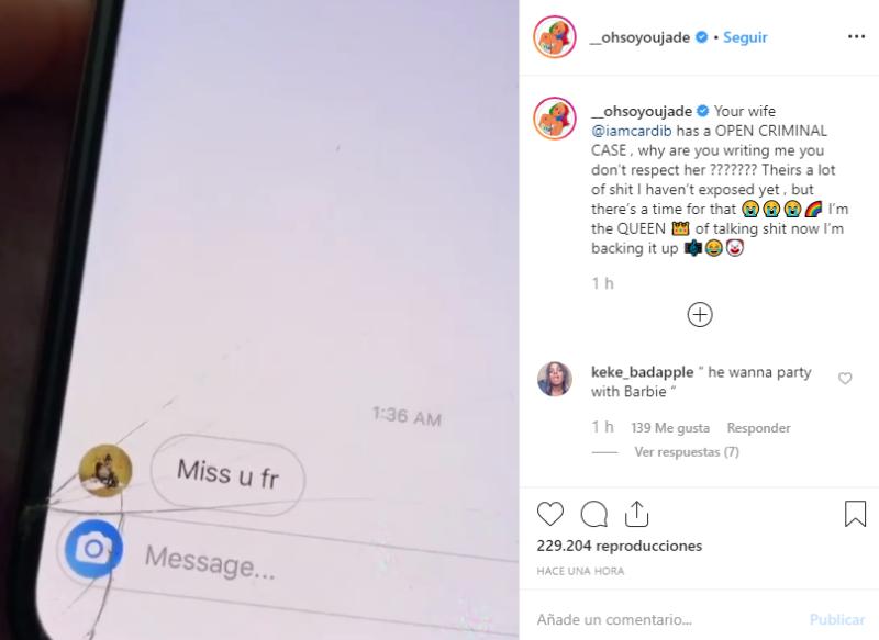 “Tu esposa Cardi B, tiene un caso penal abierto, por qué me escribes, ¿no la respetas?. Hay muchas cosas que aún no he expuesto, pero habrá un momento para eso”, escribió junto al post.