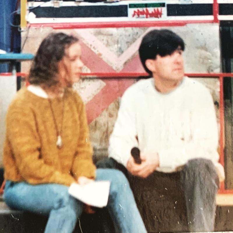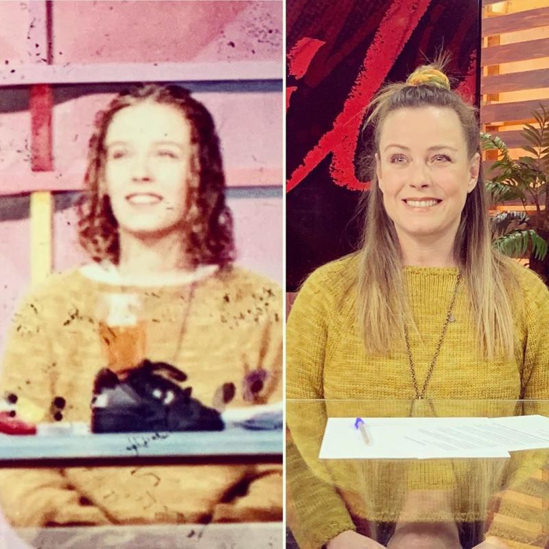 La animadora compartió un collage de dos fotos. En las dos aparece sentada, mirando hacia adelante, y luciendo el mismo chaleco verde con casi 3 décadas de diferencia.