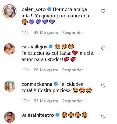 Seguidores de la intérprete y famosos del medio local la felicitaron y le dejaron lindos mensajes por esta importante etapa de su vida. “Felicidades cota, cosita preciosa”, fueron las palaras de Constanza Mackenna. “Cotita de mi corazón! Felicitaciones. Te mando todo mi amor hoy y siempre”, escribió Fernando Urrejola por su parte.