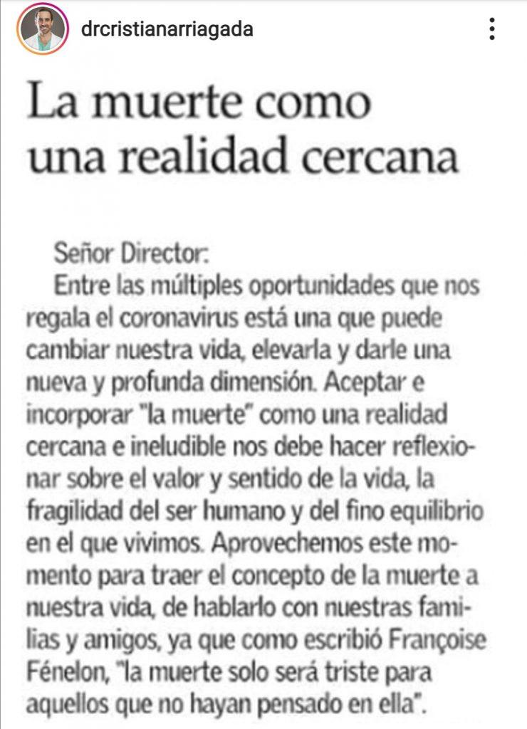El profesional de la salud envío una carta a El Mercurio sobre este tema, del que rescata la importancia de valorar la vida y pasar momentos con los que más queremos sin olvidar que la muerte está presente. "Aprovechemos este momento para traer el concepto de la muerte a nuestra vida, de hablarlo con nuestras familias y amigos, ya que ‘la muerte solo será triste para aquellos que no hayan pensado en ella", redactó.
