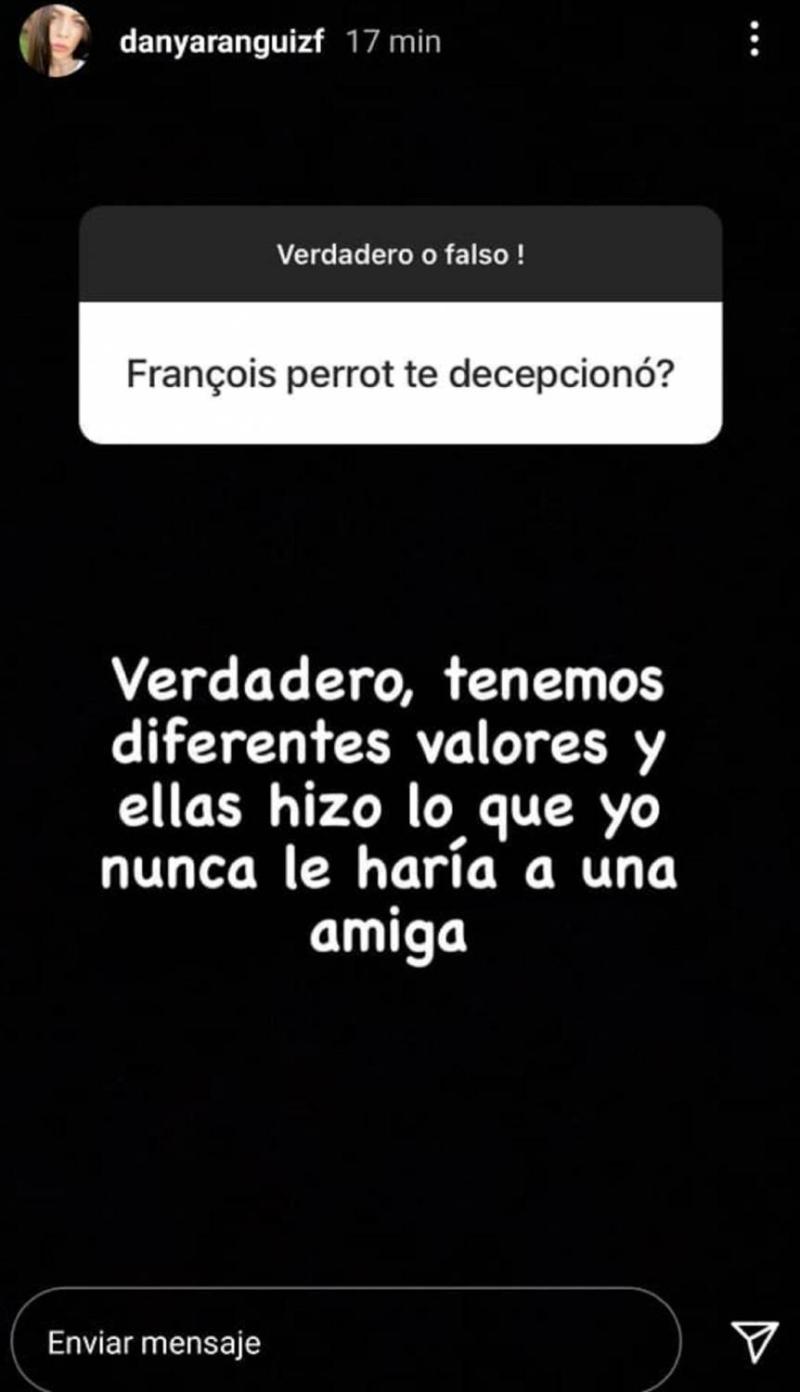 "¿Francoise Perrot te decepcionó?", preguntaron a Daniela, a lo que ella respondió: "Verdadero. Tenemos diferentes valores y ella hizo lo que yo nunca le haría a una amiga", causando el impacto de varios de sus seguidores.