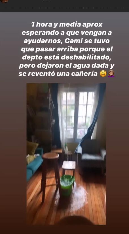 "Una hora y media aprox esperando a que vengan a ayudarnos, Cami se tuvo que pasar arriba porque el depto está deshabilitado, pero dejando el agua dada y se reventó una cañería", escribió en uno de los registros que compartió.