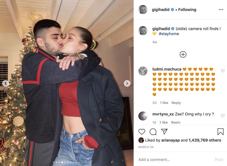 Anteriormente, la hermana de Bella Hadid dejó en evidencia que ella y el cantante estaban pasando la cuarentena juntos con un álbum donde en la cuarta foto aparecen dándose un beso, aunque precisó que eran instantáneas antiguas.