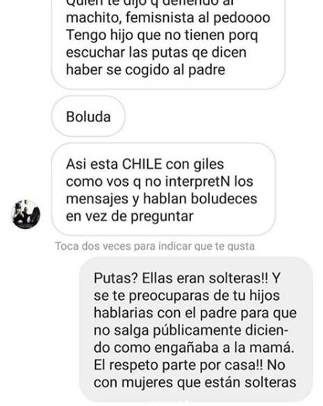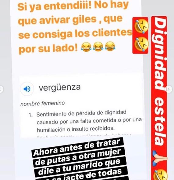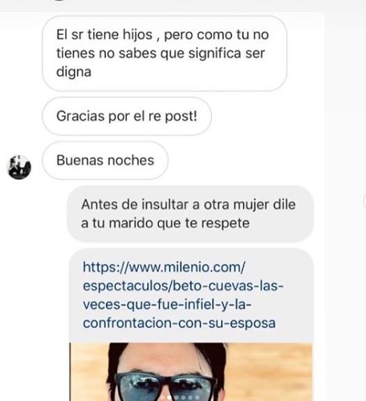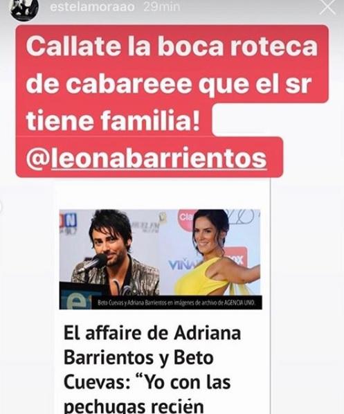 El siguiente es un pantallazo de una conversación que encabeza Estela Mora, ex esposa de beto Cuevas quien contactó a Barrientos para insultarla tras sus dichos. "El sr tiene hijos, pero como tú no tienes, no sabes qué significa ser digna. ¡Gracias por el repost! Buenas noches", dijo la modelo.