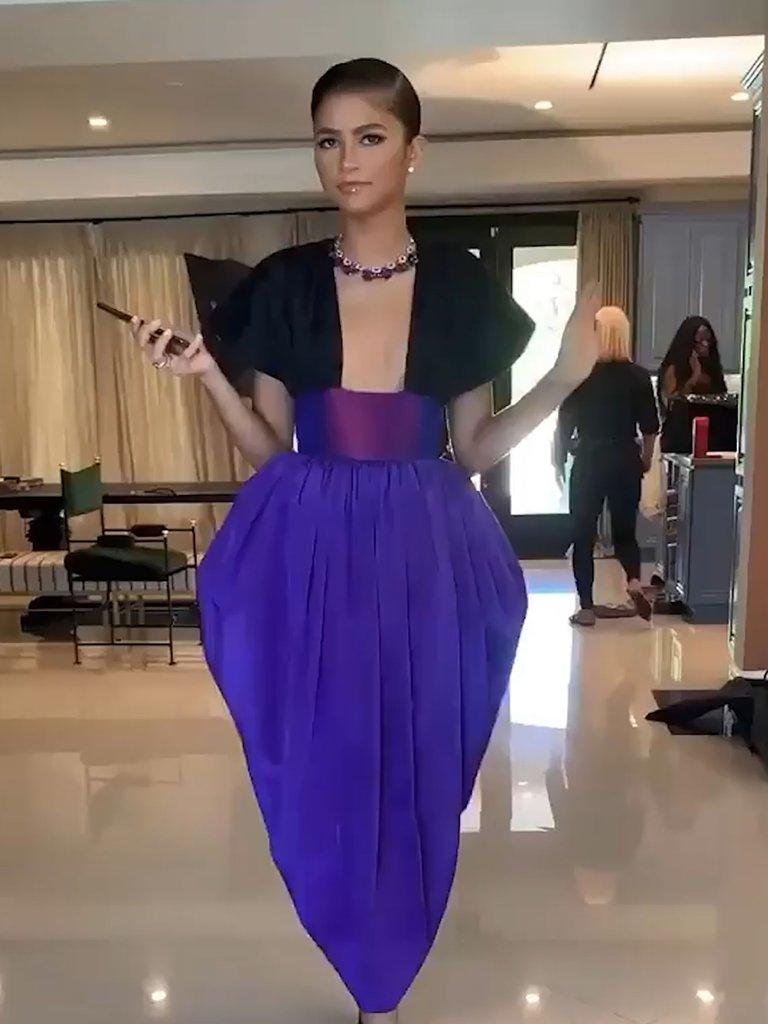 Zendaya impactó al compartir un registro donde deja ver el primer look que ocupará durante esta noche. Un diseño bi color de Christopher John Jogers, complementado con accesorios Bvlgari y zapatos de Christian Louboutin.