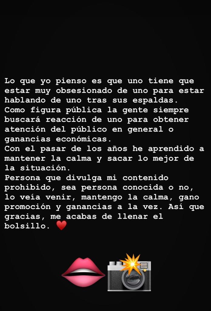“Con el pasar de los años, he aprendido a mantener la calma y sacar lo mejor de la situación. Persona que divulga mi contenido prohibido, sea persona conocida o no, lo veía venir, mantengo la calma, gano promoción y ganancias a la vez. Así que gracias, me acabas de llenar el bolsillo”, recalcó.