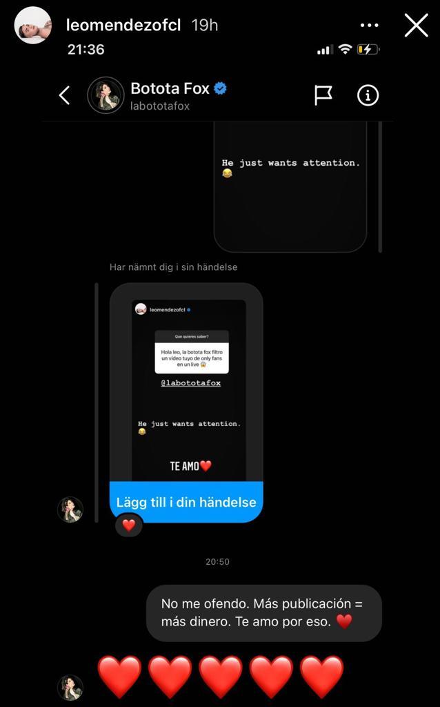 Luego, Leo decidió etiquetar a Botota Fox, afirmando en una storie que “él sólo quiere atención”. Esto generó la respuesta de la transformista, quien le escribió “te amo”. Por lo mismo, el hermano de la influencer Steffi Méndez destacó que “no me ofendo. Más publicación es igual a más dinero. Te amo por eso”.