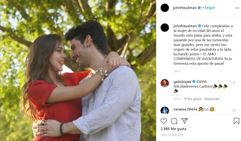 “Feliz cumpleaños a la mujer de mi vida! Mi amor el mundo está patas para arriba, y está pasando por una de las tormentas más grandes, pero me siento tan seguro de estar pasándola a tu lado, luchando juntos. TE AMO COMPAÑERA DE AVENTURAS! Ya la tormenta está a punto de pasar”, escribió.