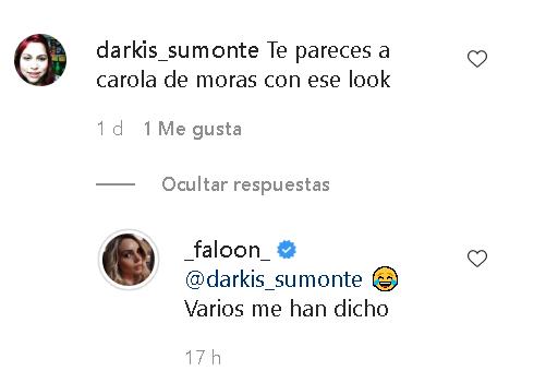 “Te pareces a Carola de Moras con este look”, le escribió una usuaria. La animadora reaccionó a esta opinión expresando que ya se lo habían mencionado antes.