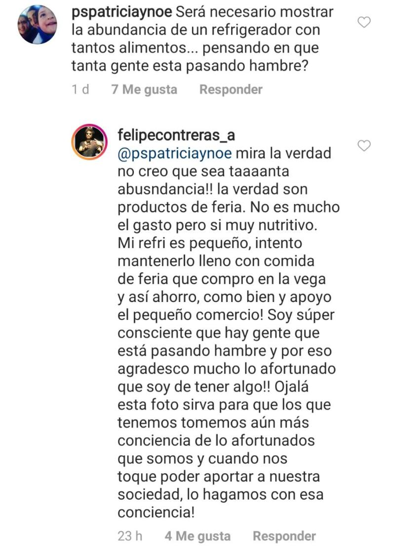 El actor Felipe Contreras compartió en Instagram una foto de su refrigerador abierto, mostrando los productos naturales que consume. Pero no esperaba que varios de sus seguidores se le fueran encima por presumir de la abundancia con la que cuenta cuando en Chile hay gente pasando hambre.