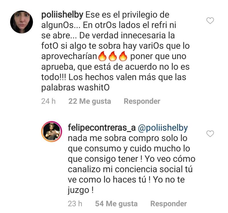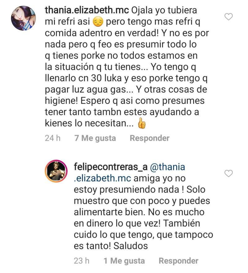 Él se defendió, asegurando que no compra de más, que esmuy consciente, y que todo lo que muestra lo compra en ferias, y no en grandes cadenas. "La verdad es que no me siento presumiendo por que no tango tanto. Eso que ven es pura feria, no voy al súper, si no por lo básico. Y espero que está foto también genere que los que tenemos algo en el refri seamos más conscientes y valoremos más lo comemos y lo que tenemos. Esa fue mi intención final", le contestó.