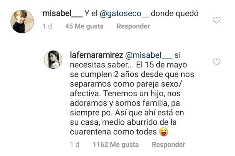 "Si necesitas saber... El 15 de mayo se cumplen 2 años desde que nos separamos como pareja sexo/afectiva. Tenemos un hijo, nos adoramos y somos familia, pa siempre po. Así que ahí está en su casa, medio aburrido de la cuarentena como todes", respondió Fernanda a una seguidora.