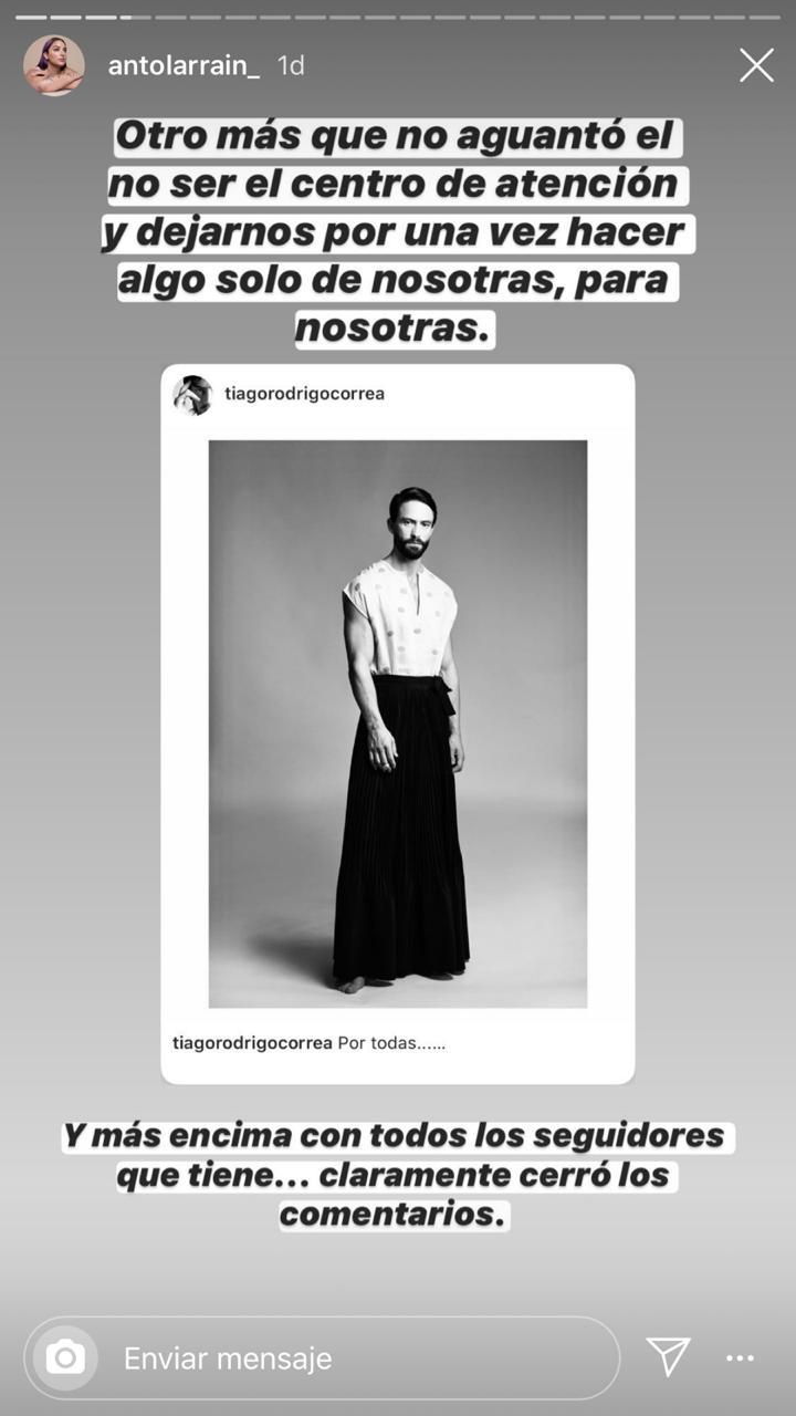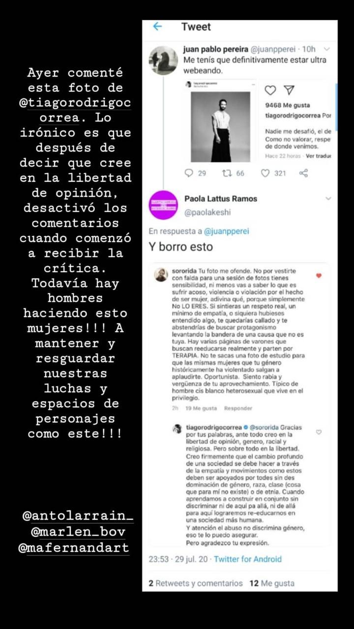 “Ayer comenté la foto de Tiago Correa. Lo irónico es que después de decir que cree en la libertad de opinión desactivó los comentarios cuando comenzó a recibir la crítica. Todavía hay hombres haciendo esto mujeres. A mantener y resguardar nuestras luchas y espacios de personajes como este”, escribió la usuaria Sororida.