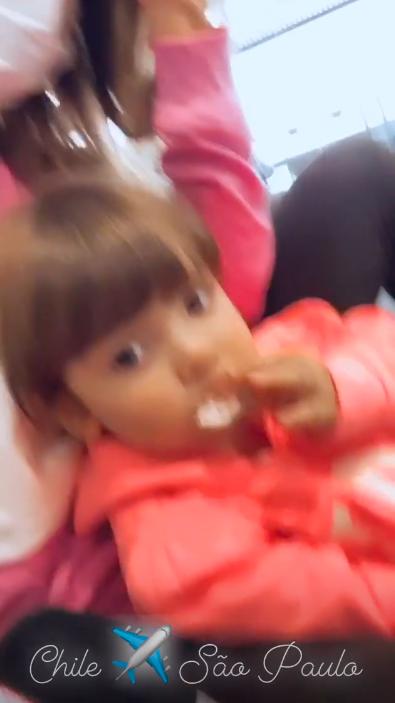 Gala Caldirola decidió dejar Chile en medio de la pandemia por coronavirus y emprender vuelo a Sao Paulo, como indica en sus redes sociales mostrándose con mascarilla y junto a su hija Luz Elif en el avión.