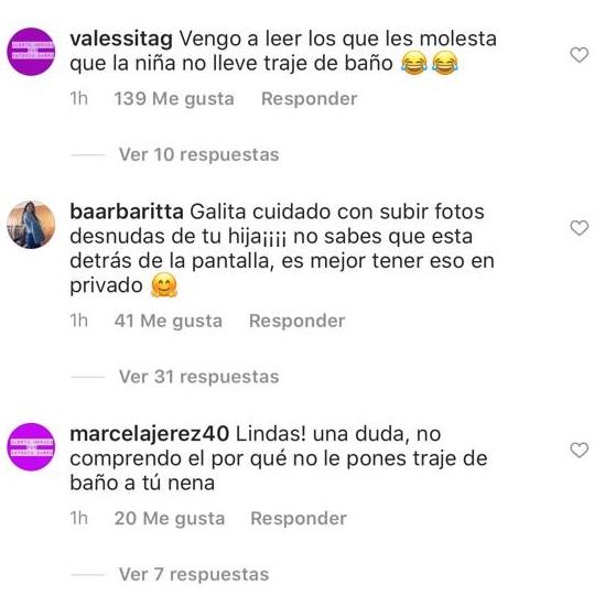 "Galita, cuidado con subir fotos desnudas de tu hija. No sabes que está detrás de la pantalla, es mejor tener eso en privado", le escribió una cibernauta seguida de otros comentarios similares.