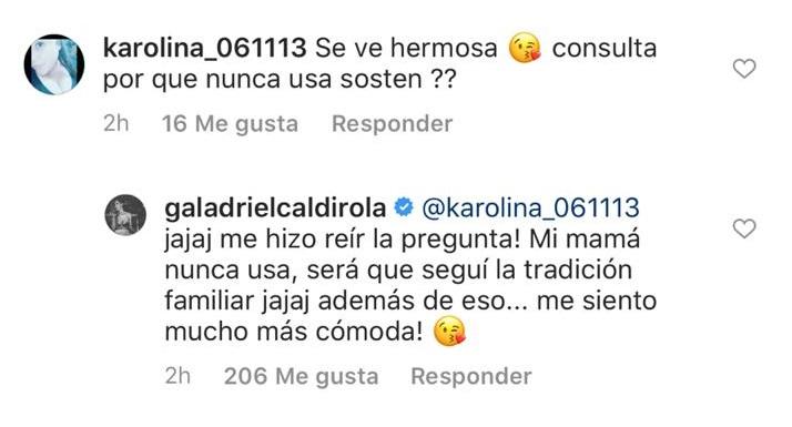 “Que le gusta poner fotos donde se le nota todo lo que hay bajo esa polera”, escribió una usuaria en esa publicación. Ante esto, otra seguidora respaldó a la ex chica reality y esta respondió con emojis de besos y risas. “Sí gente, Gala Caldirola tiene pezones, supérenlo”, redactó la mujer.