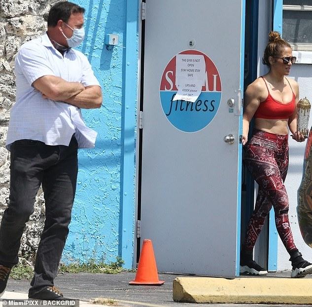 Curiosa foto muestra un letrero en la puerta del establecimiento donde se aclara que permanece cerrado y se pide a los clientes que permanezcan en sus casas... bueno, salvo Jennifer Lopez. La estrella va saliendo después de un duro entrenamiento mientras es escoltada por un guardia en mascarilla.