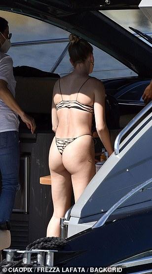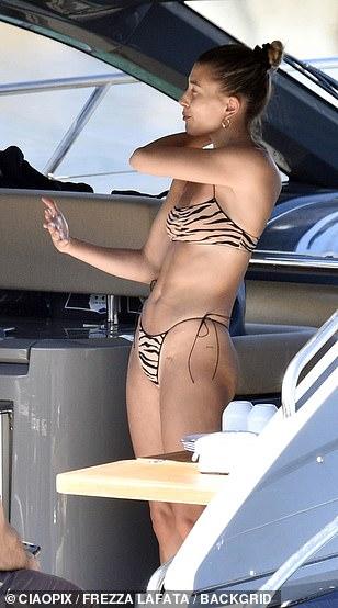 La modelo partió a Italia en compañía de Bella Hadid y se luce en micro bikini tomando sol en yate, en Cerdeña.