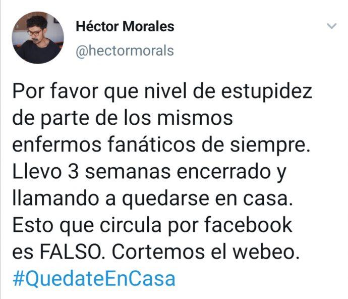 Héctor Morales a través de redes sociales salió a aclarar un rumor que lo vincula a él y al coronavirus, no de forma muy positiva. Resulta que a través de Facebook se comenzó a difundir que el actor no creía en la pandemia y es más, supuestamente llamaba a las personas a salir a protestar a las calles.