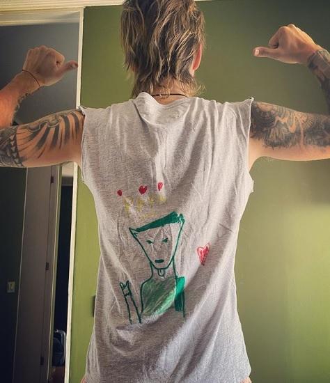 "Mi regalona me enchuló la polera. Otra actividad para l@s niños; el diseño jajaja. Corte de mangas, cuello, y dibujo de lobo rockero", redactó Cretton en la red social donde se llenó de comentarios positivos.