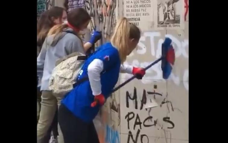 Durante el fin de semana, cientos de personas salieron a limpiar las calles del centro de Santiago, azotadas por las manifestaciones. Una joven rubia barriendo una pared e intentando borrar rayados se convirtió en meme, fue objeto de burlas en redes sociales, e incluso fue amenazada por no apoyar el movimiento social.