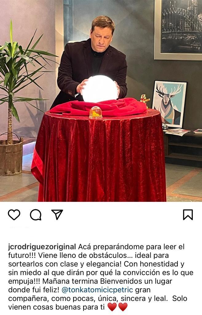 Julio César ya le había dedicado otro posteo a Tonka. “Acá preparándome para leer el futuro”, indicó al compartir una foto de él ante una bola de cristal. “Viene lleno de obstáculos… ideal para sortearlos con clase y elegancia! Con honestidad y sin miedo al que dirán por qué la convicción es lo que empuja!!! Mañana termina Bienvenidos un lugar donde fui feliz! @tonkatomicicpetric gran compañera, como pocas, única, sincera y leal. Solo vienen cosas buenas para ti”, expresó durante la noche del martes.
