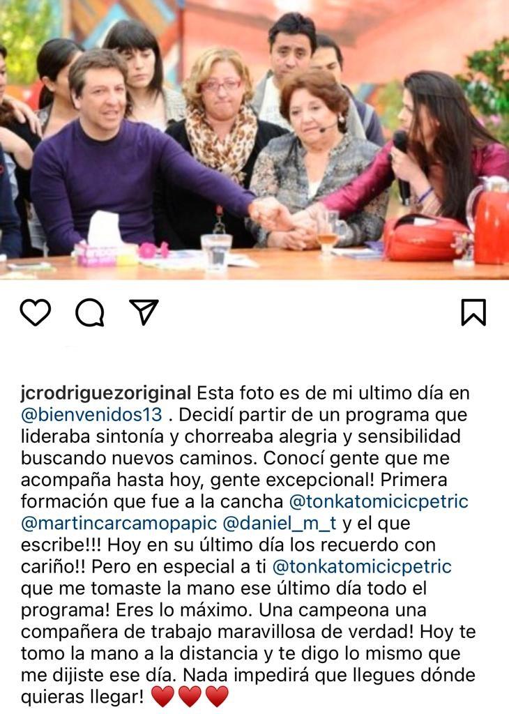 Rodríguez hizo hincapié en Tonka Tomicic. “Hoy en su último día los recuerdo con cariño!! Pero en especial a ti @tonkatomicicpetric que me tomaste la mano ese último día todo el programa! Eres lo máximo. Una campeona, una compañera de trabajo maravillosa de verdad”, aseguró, agregando que “hoy te tomo la mano a la distancia y te digo lo mismo que me dijiste ese día. Nada impedirá que llegues dónde quieras llegar”.