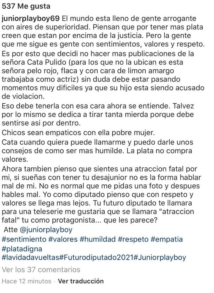 “El mundo está lleno de gente arrogante con aires de superioridad. Piensan que por tener más plata creen que están encima de la justicia. Pero la gente que me sigue es gente con sentimientos, valores y respeto. Es por esto que decidí no hacer más publicaciones de la señora Cata Pulido, sin duda debe estar pasando momentos muy difíciles ya que su hijo está siendo acusado de violación.