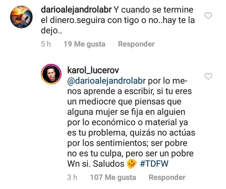 “Por lo menos aprende a escribir. Si tú eres un mediocre que piensas que alguna mujer se fija en alguien por lo económico o material, ya es tu problema, quizás no actúas por los sentimientos; ser pobre no es tu culpa, pero ser un pobre Wn sí. Saludos”, escribió.