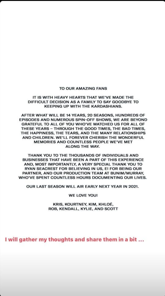 Con gran pesar hemos tomado la difícil decisión como familia de despedirnos de Keeping Up with the Kardashians.