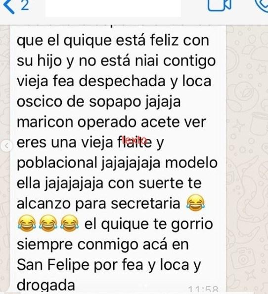 “Esto me acaba de llegar a mi celular. La verdad no me interesa lo que diga de mí. Se nota la envidia, pero si se mete con mi hija espero sepa rezar. Es fácil mandar mensajes de este tipo por teléfonos de otra persona y esconderse", escribió Roxana junto al post.