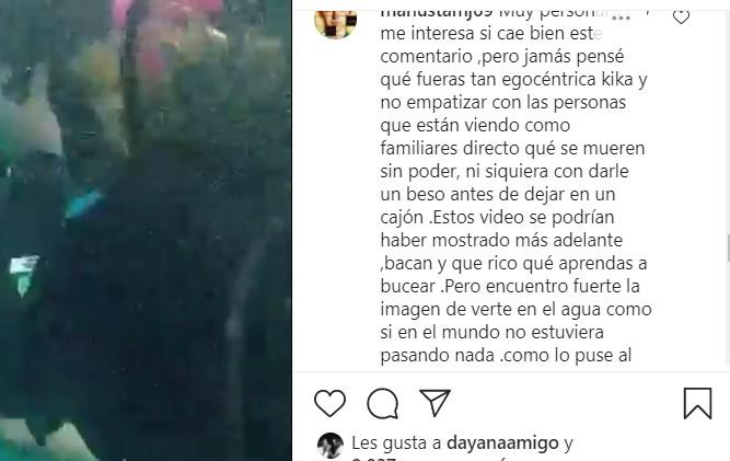 “Muy personal y no me interesa si cae bien este comentario ,pero jamás pensé qué fueras tan egocéntrica kika y no empatizar con las personas que están viendo como familiares directo qué se mueren sin poder, ni siquiera con darle un beso antes de dejar en un cajón .Estos video se podrían haber mostrado más adelante ,bacan y que rico qué aprendas a bucear .Pero encuentro fuerte la imagen de verte en el agua como si en el mundo no estuviera pasando nada .como lo puse al principio de este comentario es personal y es lo que yo siento no te juzgo nada “, escribió otro.