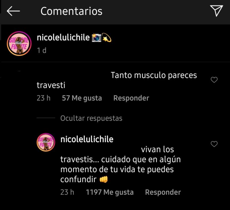 No es primera vez que "Luli" recibe comentarios relativos a su físico. La ex reina del Festival de Viña del Mar publicó una fotografía luciendo su trabajada figura y sus llamativos músculos, hecho que no sorprende ya que Nicole Moreno lleva bastante tiempo ligada al mundo fitness.