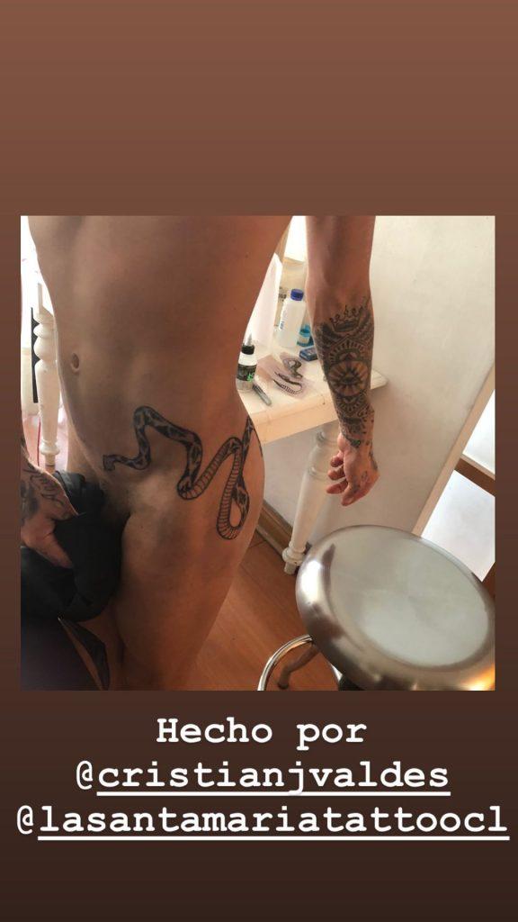 El concursante del estelar de Canal 13 "Bailando por un Sueño" se luce frente a un espejo cubriendo lo justo y necesario para no ser censurado por Instagram. El tattoo es una serpiente que recorre desde su pelvis hasta su trasero.