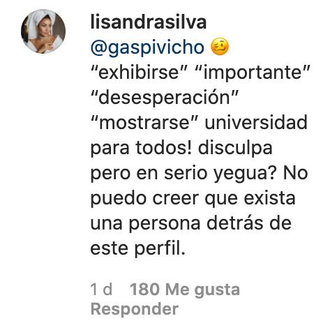 El comentario del usuario hace alusión a que Lisandra parece estar desesperada por exhibirse en poca ropa y la ex chica reality por supuesto no se quedó callada al respecto.