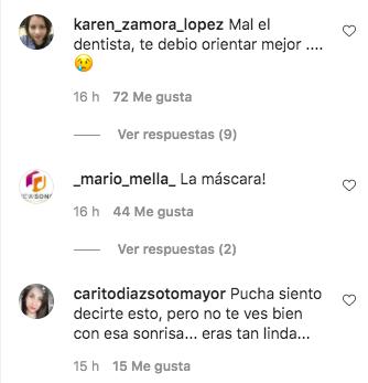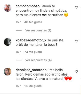 "Mal el dentista, te debio orientar mejor", "Pucha siento decirte esto, pero no te ves bien con esa sonrisa... eras tan linda", "Faloon te encuentro muy linda y simpática, pero tus dientes me perturban", "Eres bella falon. Pero demasiado artificiales los dientes. Vuelve a lo natural", "Pepe cortisona?", son algunos de los mensajes que recibió.