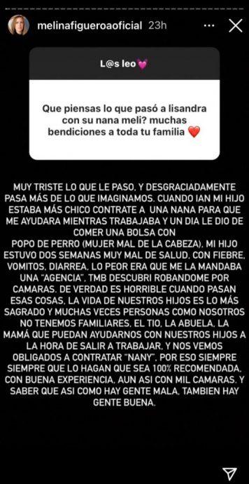 Tras esto, otra chica reality, Melina Figueroa, recibió una pregunta en su cuenta de Instagram respecto a lo ocurrido con Lisandra, sin embargo, impactó con un relato que da cuenta de una horrible situación que vivió con su nana.