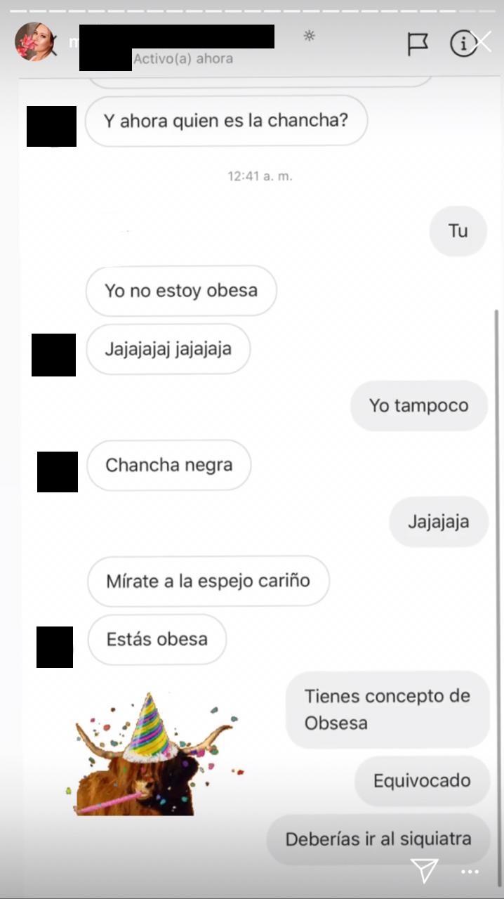 “¿Y ahora quien es la chancha negra?”, le escribió la usuaria. ”Mírate al espejo cariño, estás obesa”, agregó esta mujer. “Tienes concepto de obesa equivocado, deberías ir al siquiatra”, respondió la modelo.