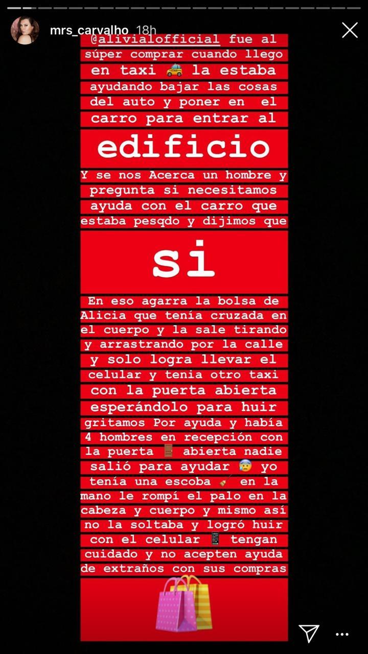 La brasileña cuenta que fue intimidada junto a una amiga luego de hacer las compras en el supermercado, precisamente cuando bajaban las bolsas del taxi donde venían. El robo se produjo luego de que un sujeto les ofreciera ayuda para cargar las cosas, pues fue ahí cuando les arrebató todo y salió corriendo.