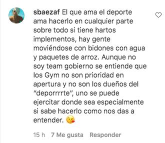 "Aburrida de entrenar en casa, prefieren tener los gimnasios cerrados y tener sin trabajo a las personas que se sacaron la mierda toda su vida! Trabajando y estudiando… claro po se lavan las manos despidiendolos pero sí no se olvidan de cobrar la membrecía todos los meses (Aunque estén cerrados los gym) Tan ignorante es este Gobierno que no sabe el daño que estan causando! Mentiraaaaaaaa que nos cuidan… Aprendan a ser organizados como en otros países. Somos un aporte que no quieren! Abrir en fase 5, aprendan de los protocolos de otros países. EL DEPORTE NO ES BELLEZA ES SALUD!", declaró junto a la publicación.