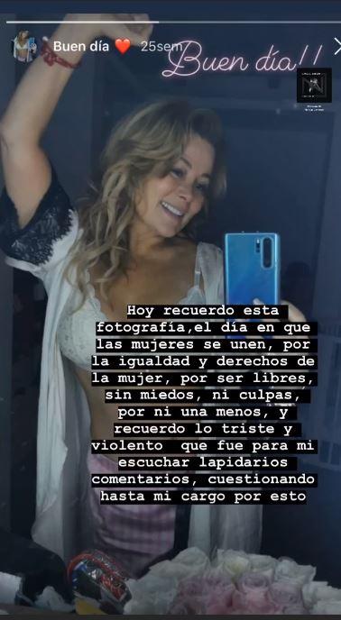 “Hoy recuerdo esta fotografía, el día en que las mujeres se unen, por la igualdad y derechos de la mujer, por ser libres, sin miedos, ni culpas, por ni una menos, y recuerdo lo triste y violento que fue para mí escuchar lapidarios comentarios, cuestionando hasta mi cargo por esto”, comenzó diciendo por una foto en la que aparece en su clóset y usando lencería.