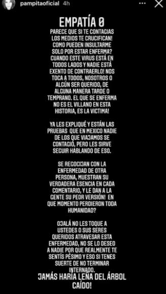 "Empatía 0. Parece que si te contagias los medios te crucifican ¿Cómo pueden insultarme por estar enferma?", señaló la argentina y agregó que "este virus está en todos lados y nadie está exento de contraerlo. Nos toca a todos, nosotros o algún ser querido, de alguna manera tarde o temprano. El que se enferma no es el villano en esta historia, es la víctima", comentó.