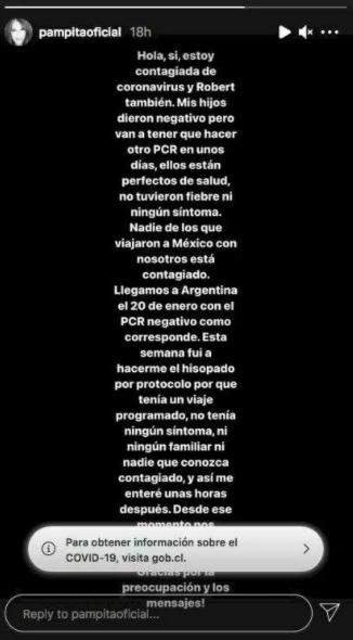 "Hola, sí, estoy contagiada de coronavirus y Robert también. Mis hijos dieron negativo, pero van a tener que hacer otro PCR en unos días. Ellos están perfectos de salud, no tuvieron fiebre ni ningún síntoma", escribió Pampita.