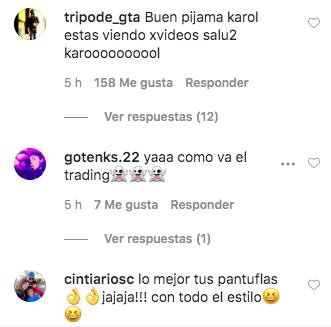 Y fuera de lo que muchos pueden creer, Karol luce en pijama, tal cual. Y lo que llama la atención son sus pantuflas, de garras rosadas que sacaron carcajadas entre sus seguidores.