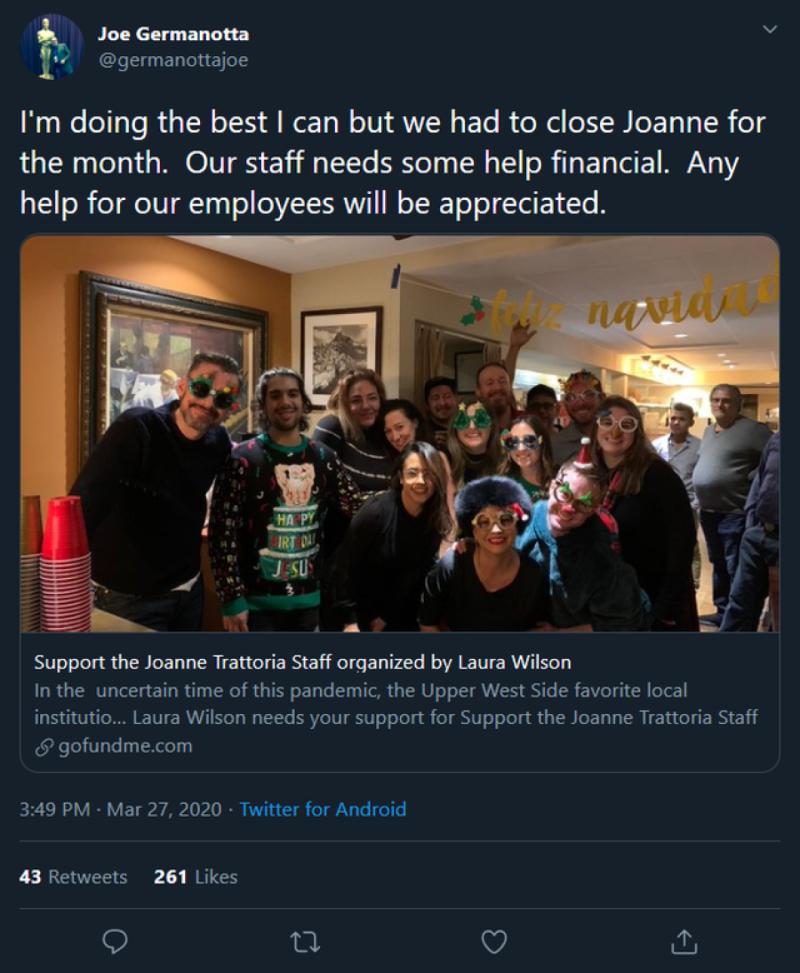 “Pedimos a nuestra comunidad de vecinos, amigos, familiares y comensales de Joanne Trattoria: si nos ha visitado en el pasado, ha tenido un encuentro amistoso con alguien de nuestro increíble personal de servicio, o incluso si espera disfrutar de nosotros en el futuro, estaríamos muy agradecidos si considerara donar a nuestro personal para ayudarlos en este momento difícil”, dice en esta plataforma de financiamiento.