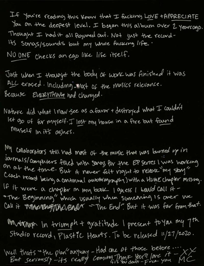 "Si están leyendo esto... sepan que realmente los amo y aprecio a ustedes en el nivel más profundo que existe. Empecé este álbum hace dos años atrás. Pensé que lo tenía todo resuelto. No solo el álbum con sus canciones y sonidos, sino también mi maldita vida...", escribió al comienzo del anuncio.