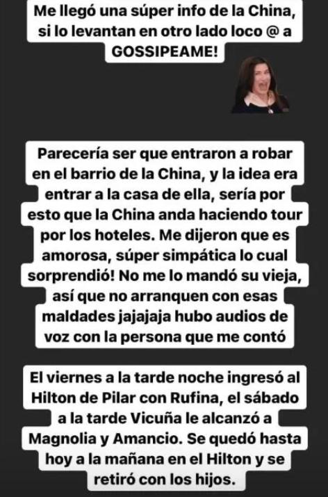 Tras unos meses de paz vino la mala noticia y todo incida que China Suárez sufrió un robo. "Parecería que entraron a robar en el barrio de la China, pero la idea era entrar a la casa de ella. Sería por ésto que la China anda haciendo tour por los hoteles", publicó la prensa rosa trasandina.