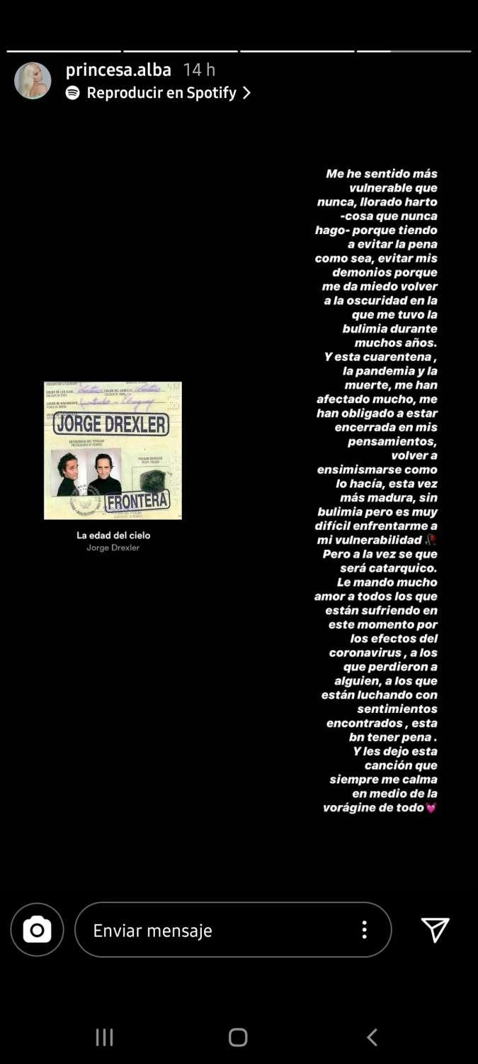 “Y esta cuarentena, la pandemia y la muerte me han afectado mucho, me han obligado a estar encerrada en mis pensamientos, volver a ensimismarme como lo hacía, esta vez más madura, sin bulimia. Pero es muy difícil enfrentarme a mi vulnerabilidad… pero a la vez será catártico", continuó.