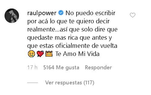 “No puedo escribir por acá lo que te quiero decir realmente...así que solo diré que quedaste más rica que antes y que estas oficialmente de vuelta. Te Amo Mi Vida”, escribió.